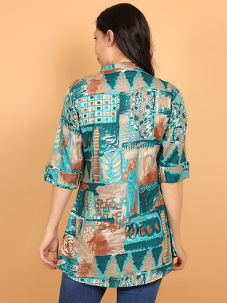 FIMS - Fashion is my style Rayon Abstract Printed Short Kurti for Women, Mandarin Collar V Neck, Roll-Up Sleeves